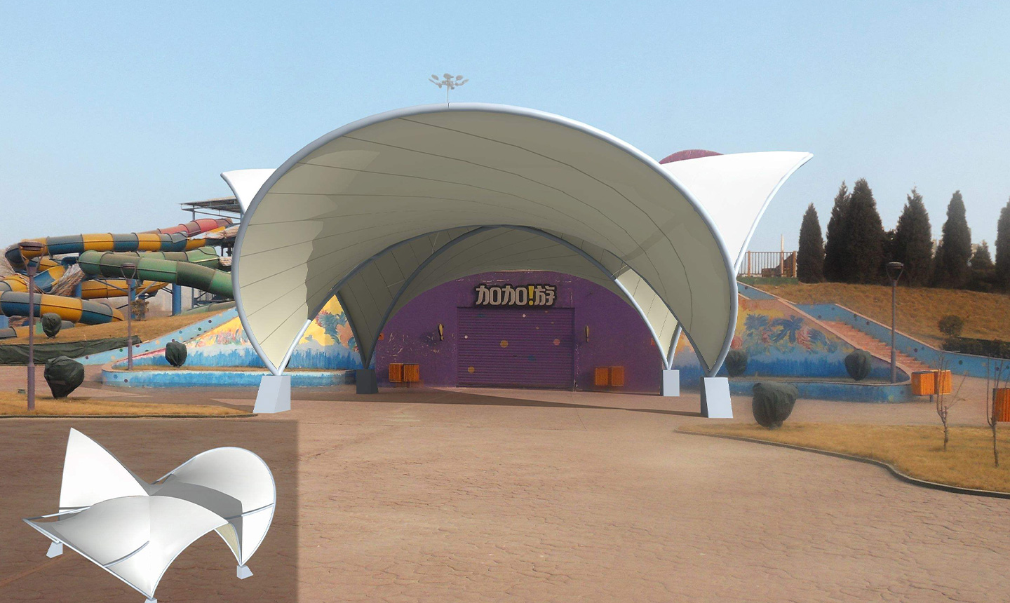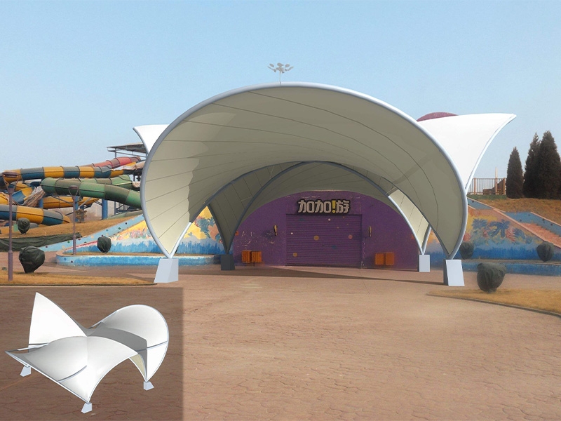 1、舞臺張拉膜結構的共同曲面外形使其具有激烈的雕塑感,膜面經過張力到達自平衡。