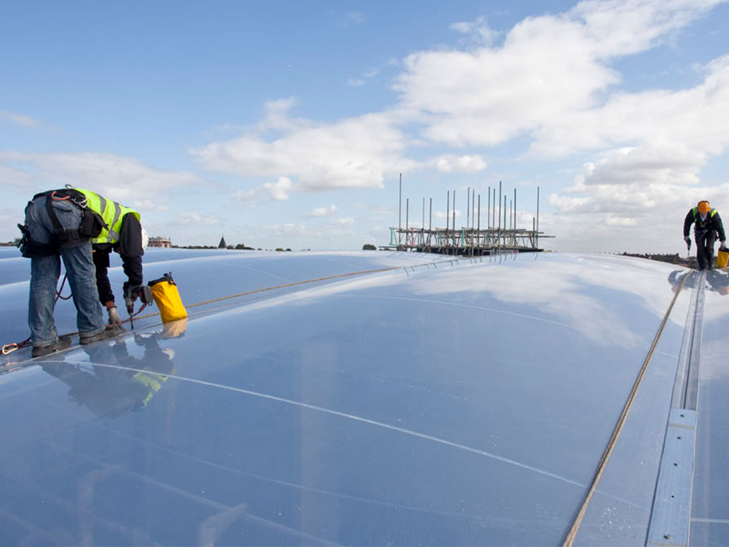ETFE膜結構由鋁型材邊框將氣枕邊緣固定然后支撐在輕型鋼結構上,氣枕由低氣壓充氣使其能夠隔熱并承受風載。氣枕由多層膜加工制作而成,不會因紫外線照射或大氣污染而發生質量退化,ETFE膜材最大透光率可達94-97%,使用壽命極長,膜表面光滑可抗灰塵附著,在雨季,整個外表面只靠雨水沖刷即可;ETFE可做成多層膜系統,或加印花圖案,用不同顏色等方式來渲染建筑外形,同時還可在每層膜上加LED燈。ETFE膜材含有氟元素為不易燃材料,而且可以自滅,而且膜材本身具有韌性及很高的抗撕裂能力,在拉長300%至400%的條件下仍保持高強度。