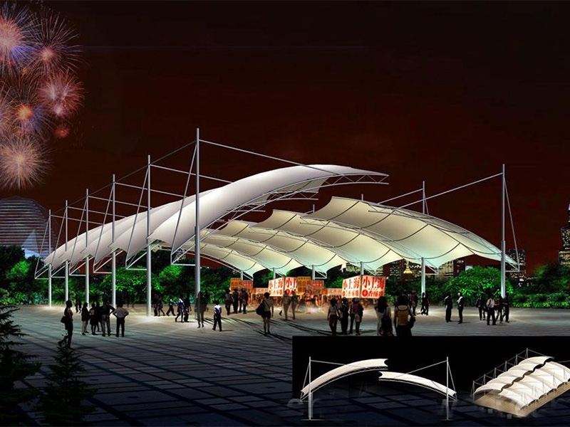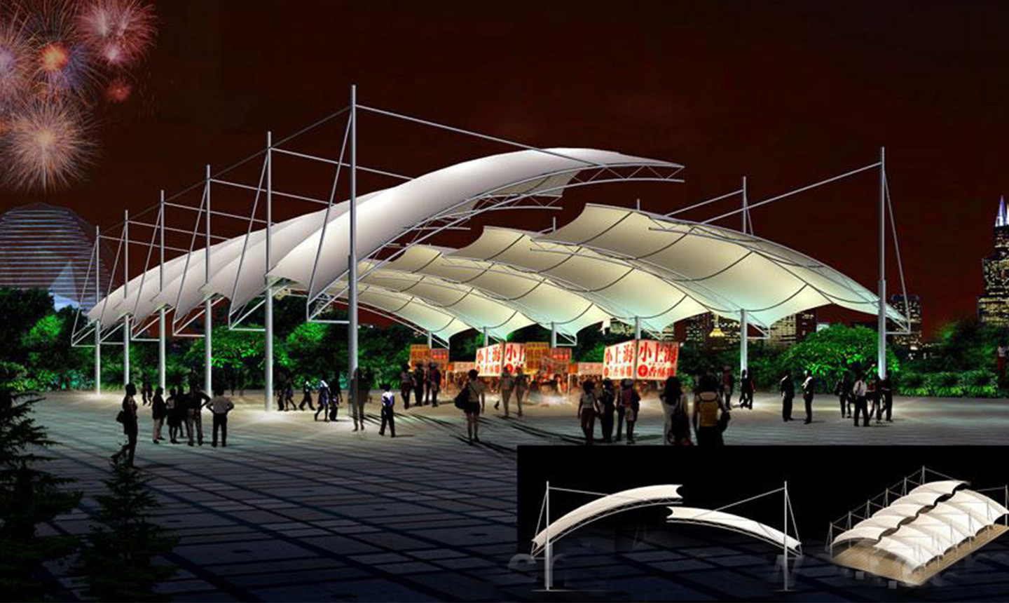 膜結構由于其材料重量輕、支撐方式靈活的特點使其形狀變化多端,使設計者能夠充分發揮空間想象。大部分膜結構工程的造型是非常活潑漂亮的,膜結構工程不但打破了傳統建筑形式的沉悶,而且非常具有張力和雕塑感,能展現建筑形式的現代氣息,與傳統建筑的多線造型相比,膜結構工程建筑以其優美的曲線造型吸引人,與周邊建筑相輔相成的同時也讓人眼前一亮。特別是大型地標利用奇特的膜結構造型營造夢幻般的夜間景觀效果,增加其認知度和商業效果。